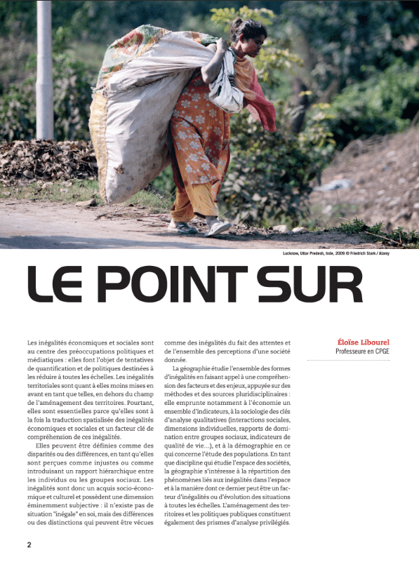 La géographie étudie l’ensemble des formes d’inégalités en faisant appel à une compréhension des facteurs et des enjeux, appuyée sur des méthodes et des sources pluridisciplinaires : elle emprunte notamment à l’économie un