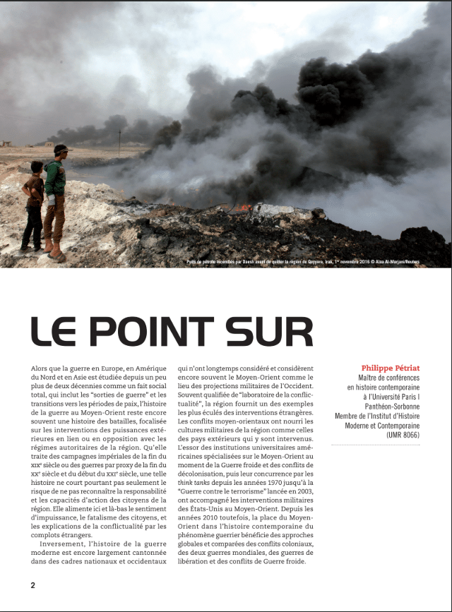 Alors que la guerre en Europe, en Amérique du Nord et en Asie est étudiée depuis un peu plus de deux décennies comme un fait social total, qui inclut les “sorties de guerre” et les transitions vers les périodes de paix, l’histoire de la guerre au Moyen-Orient reste encore souvent une histoire des batailles, focalisée sur les interventions des puissances extérieures en lien ou en opposition avec les régimes autoritaires de la région. Qu’elle traite des campagnes impériales de la fin du XIXe